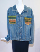 Kathy’s free-style Saori weaving transforms thrifted denim into wearable art. Each upcycled jacket is embellished with her playful, handwoven fabric—front and back—for a truly one-of-a-kind, artsy statement piece. Size L: 42" bust; 23" long