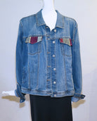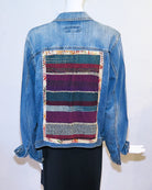 Kathy’s free-style Saori weaving transforms thrifted denim into wearable art. Each upcycled jacket is embellished with her playful, handwoven fabric—front and back—for a truly one-of-a-kind, artsy statement piece. Size L: 44" bust; 23" long