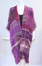 Kathy loves anything "free-style" that relates to fiber arts, which makes Saori the perfect choice for expressing her artistic voice. This beautiful ruana is a handwoven mix of cotton and silk with wool and mohair accents. It is finished nicely with elbow length sleeves, on-seam pockets and finished collar. One size: 52" bust with the front open slightly; 38" long, including fringe