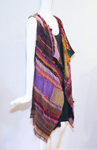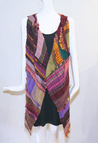 Kathy loves anything "free-style" that relates to fiber arts, which makes Saori the perfect choice for expressing her artistic voice. This beautiful tunic length vest is a colorful mix of cotton and silk with wool and mohair accents. Cascading front and 8" side slits allow it to drape beautifully. Size M: 36" bust with a relaxed front lapel; 36" length front; 34" length back, including fringe