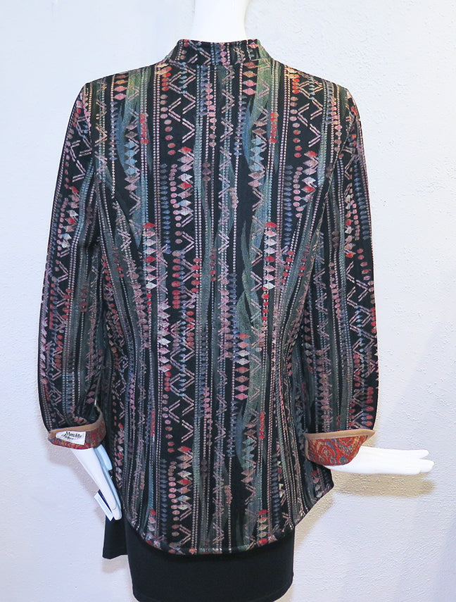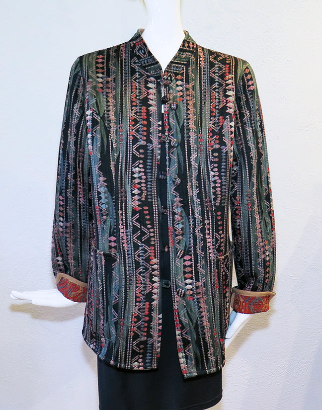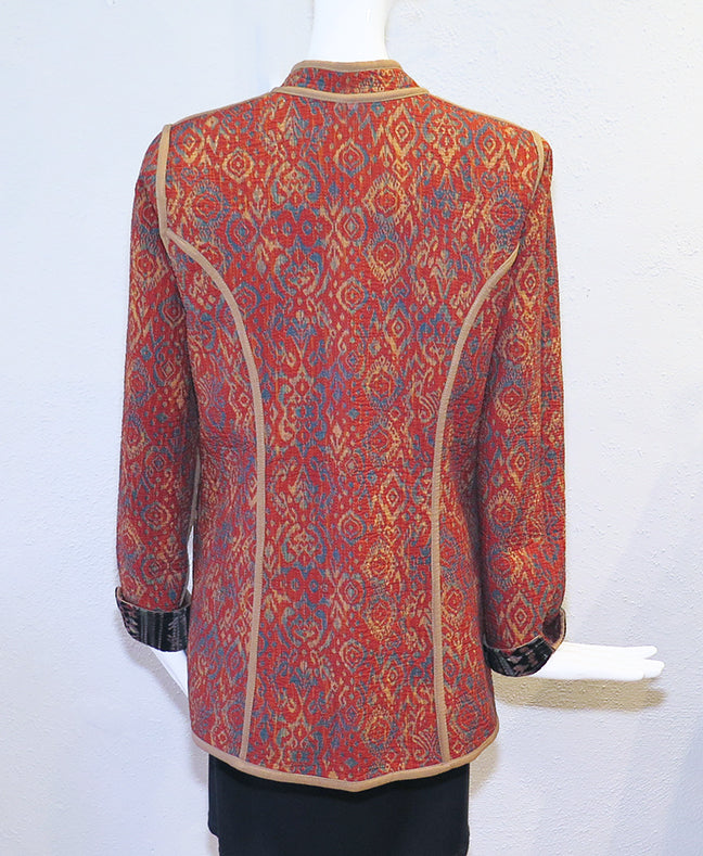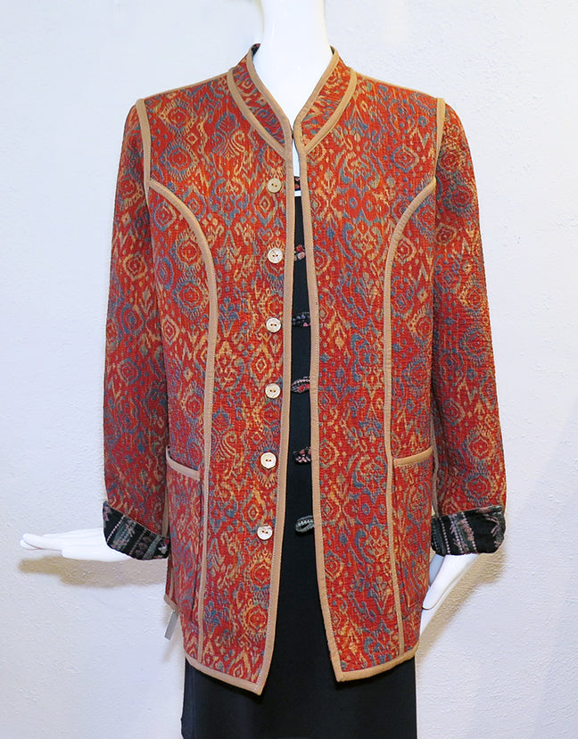 Meredith travels to Uzbekastan to choose the fabrics for these jackets. Lovely medium weight quilted cotton with flattering princess seams, long sleeves, buttons and pockets on both sides. Nicely finished with attention to detail; Plus, they're REVERSIBLE -- which makes them great for travel. Each pattern collection is a limited edition available in sizes 4-16. Contact the store to check availability for other sizes. Size 52 - 44" bust; 26" overall length.