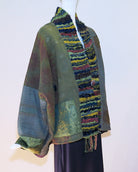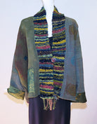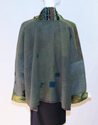 This coat was made from three different salvaged cotton Kantha quilts. The coat is in beautiful colors of blue, green, rusty red and bits of teal. The shawl collar was handwoven by Debby from her fabric scraps and contains bits of silk, cotton, wool, rayon and linen. The cuffs and pocket are from a silk scarf, which is the dreamiest olive green color. And the glass button was handmade by an artist friend.