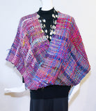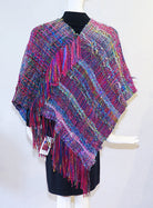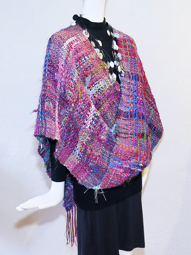 This fancy ponchette is handwoven using a mix of fibers, so it's loaded with color and texture and a little bit of metallic silver for a little sparkle. Fashioned in an easy to wear style that fits almost any body -- it's like a shawl, but you don't have to fuss with it. Slip it over your head like a poncho and you're ready to go! Styled with a vine wrap necklace from Beyond Threads.