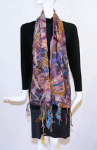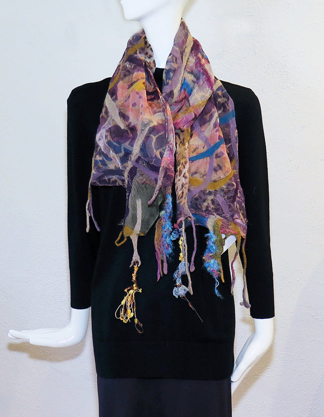 Cedide's Surprise Scarves are so much fun! Nuno felted silk and wool are combined for a beautiful one-of-a-kind wearable art scarf. Whisper light silk and fine merino with mixed trims. Hand wash; line dry. 1" - 9" wide x 72" long