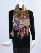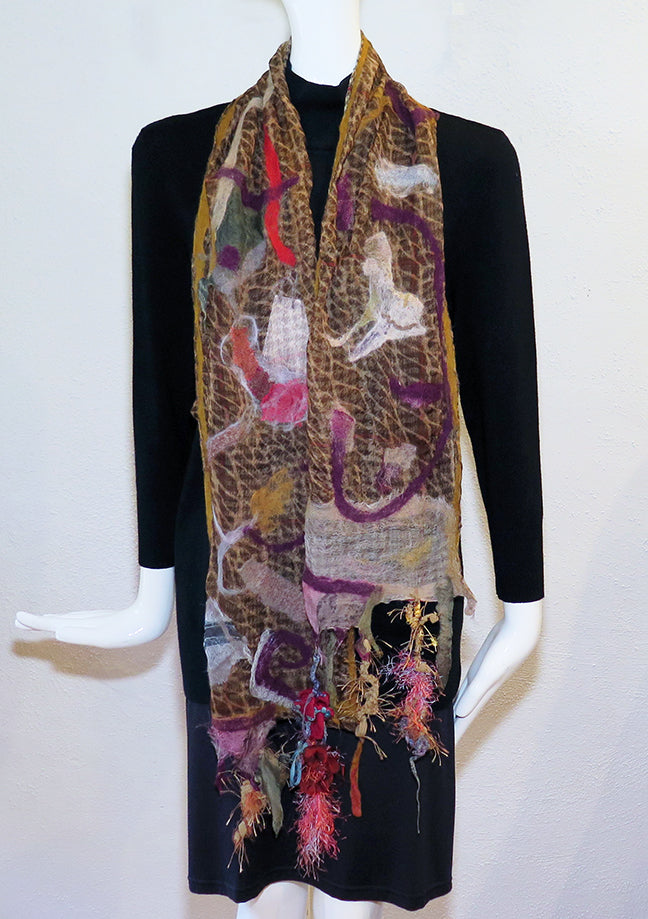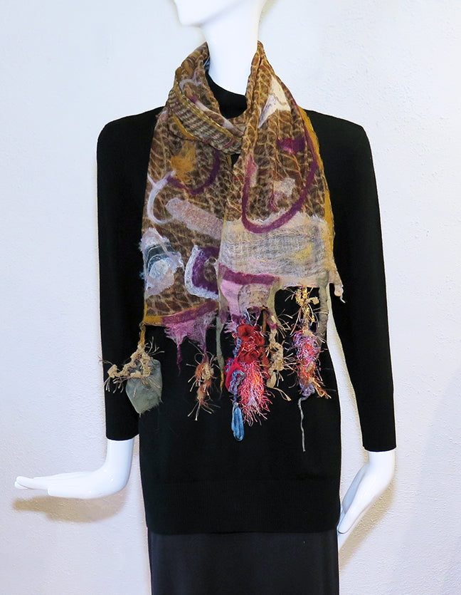 Cedide's Surprise Scarves are so much fun! Nuno felted silk and wool are combined for a beautiful one-of-a-kind wearable art scarf. Whisper light double layer silk and fine merino with mixed trims. Hand wash; line dry. 8" wide x 68" long
