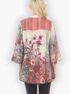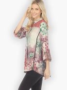The Citron Mandarin collar blouse features 3/4 sleeves, slightly fitted with high/low hem in a beautiful textured 57% Viscose; 38% Silk/5% Spandex blend. Covered button front and figure flattering black piping detail. Size S - 40" bust; 28" - 31" front/back length