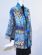 The versatile kimono jacket is a new favorite with fans of Elizabeth's handwovens. It's simply tailored with 3/4 length sleeves, a shawl collar and patch pockets. Cotton, silk and rayon blend with her signature discharge dyed technique. Flattering on a variety of body types. One size: 42" bust; 24" length