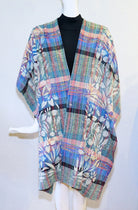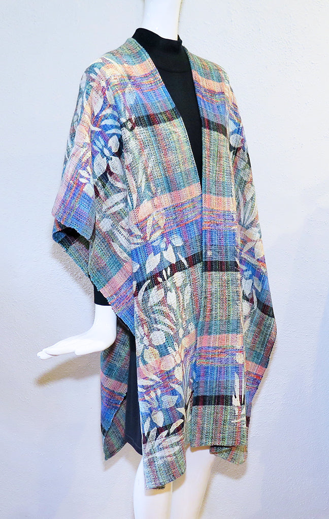 The versatile ruana features Elizabeth's cotton, silk and rayon handwoven fabric with her signature discharge dyed technique. One size fits most.