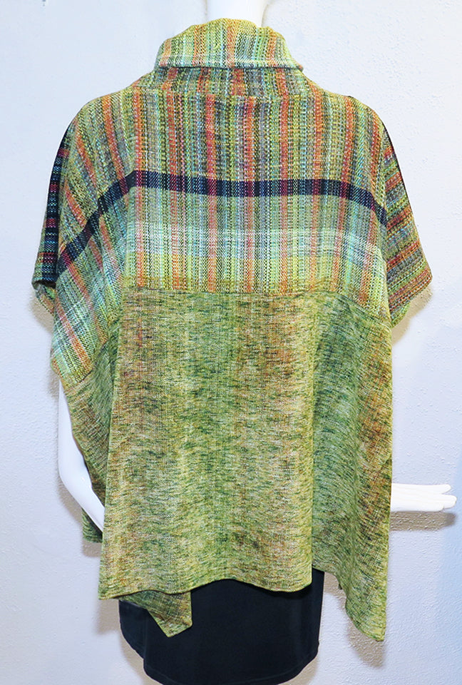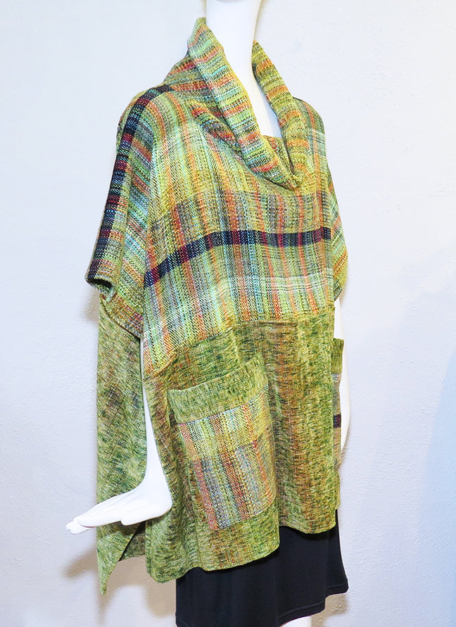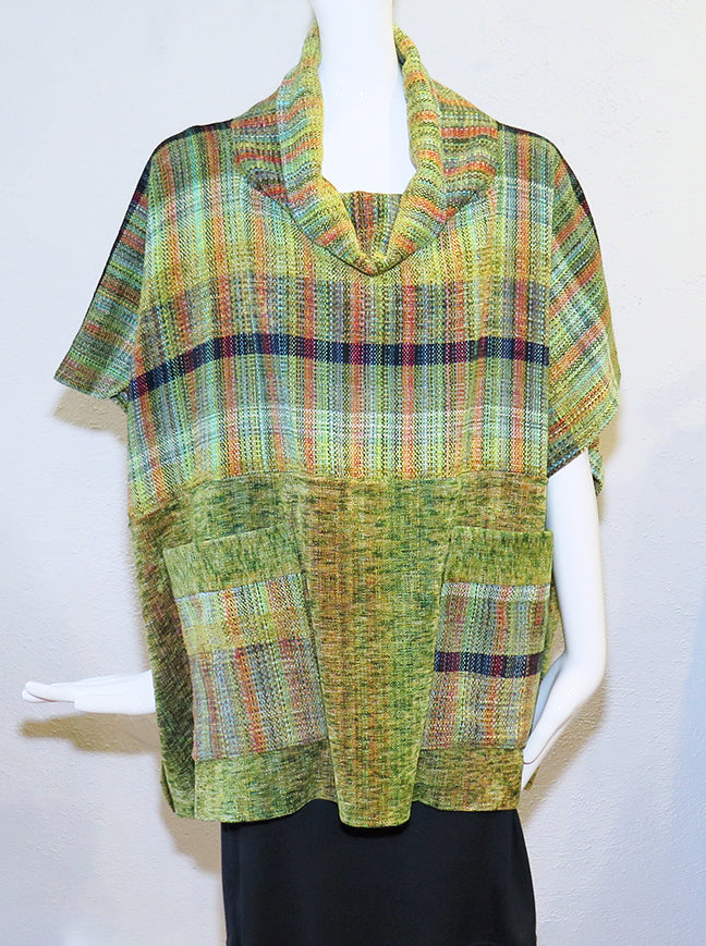This tunic top features Elizabeth's cotton, silk and rayon handwoven fabric with cowl neck, elbow length sleeves, two patch pockets, 6" side slit and hi/low hem. One size fits most - 78" bust; 25" - 27" hi/low length.