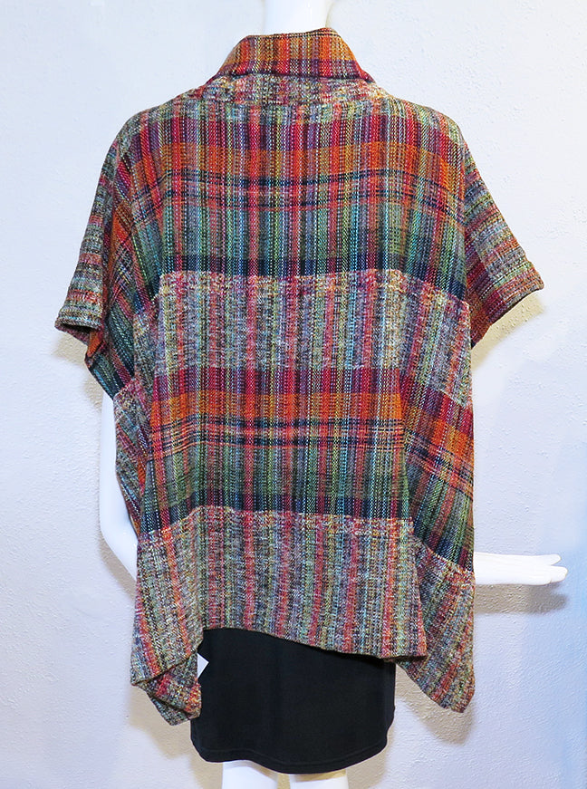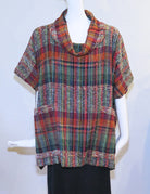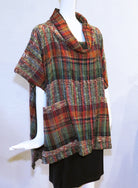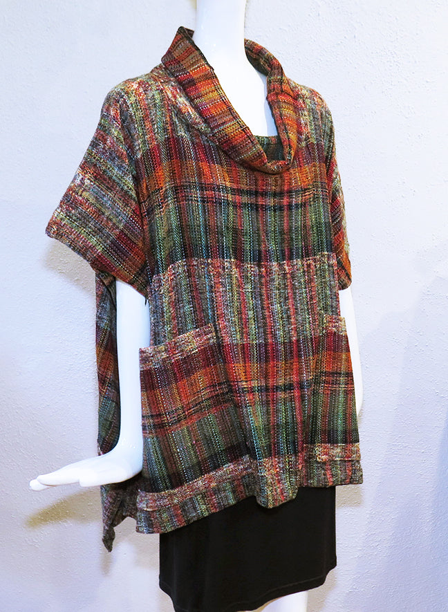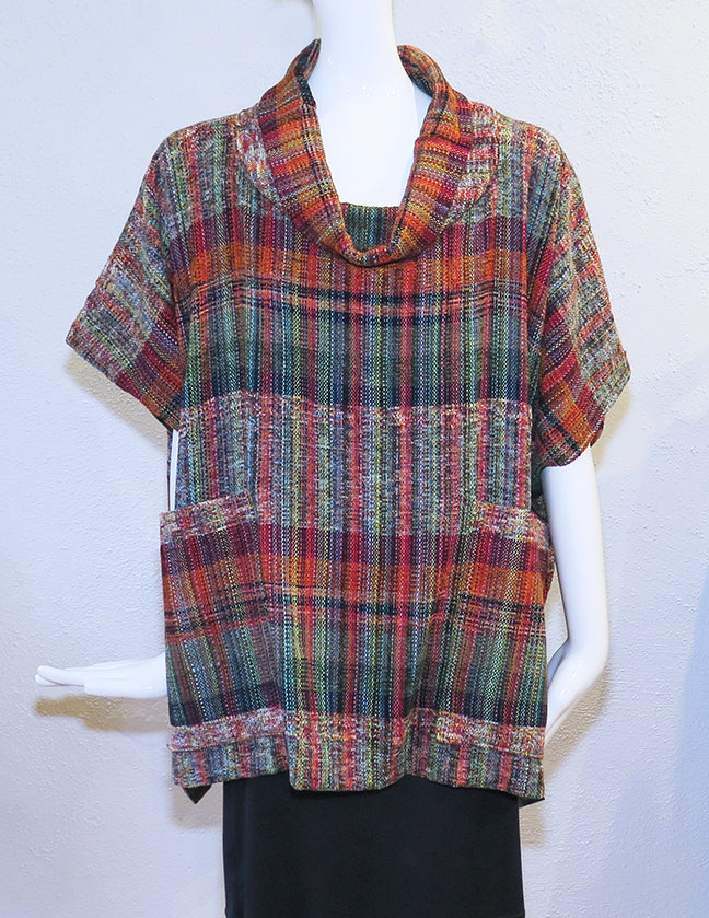 This tunic top features Elizabeth's cotton, silk and rayon handwoven fabric with cowl neck, elbow length sleeves, two patch pockets, 6" side slit and hi/low hem. One size fits most - 78" bust; 25" - 27" hi/low length.
