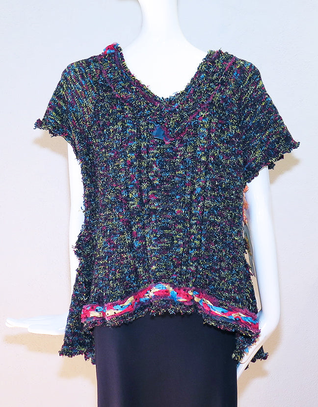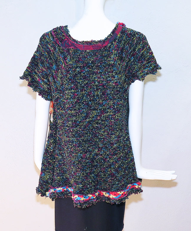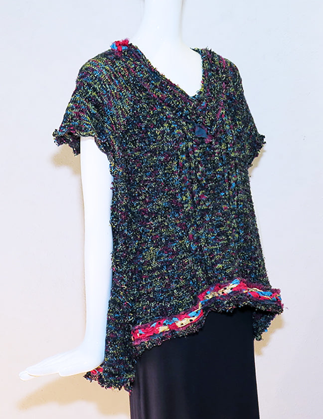 Kathy's "Primary Colors" knit tunic top is part of the Altered Eco Collection. This handmade one-of-a-kind upcycled fun and funky tunic top uses a mixture of acrylic knits and braided sari silk embellishments. It has swallowtail side panels making it a little longer front to back. Size S/M - 40" bust; 21" length front; 27" length back