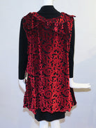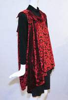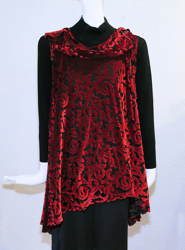 Kat's "Red Renaissance" velvet tunic is part of her Altered Eco Collection. This handmade one-of-a-kind sleeveless tunic features a rich red poly/rayon velvet fabric, with a lovely draped neckline, swallowtail side panels, and a chic tunic length. One size - 52" bust; 28" - 33" asymmetrical length