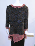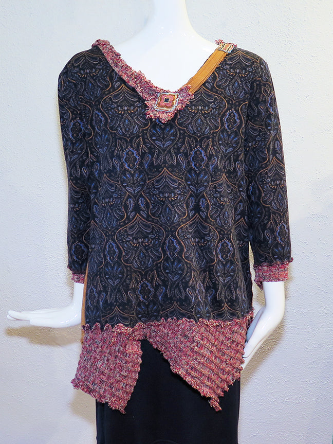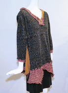 Kathy's "Winter Solstice" cotton knit tunic top is part of the Altered Eco Collection. This handmade one-of-a-kind upcycled fun and funky tunic top uses a mixture of cotton knit fabrics and kantha accents. It has swallowtail side panels and contrasting neck and hem. Size XS/S - 38" bust; 25" - 29" asymmetrical length