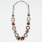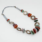The Leather Luxe Spectrum Necklace features an array of vibrant leather pieces intermixed with hand-poured resin elements. The contrast between smooth resin and textured leather creates a captivating interplay of light and form. Adjustable for a comfortable fit.