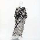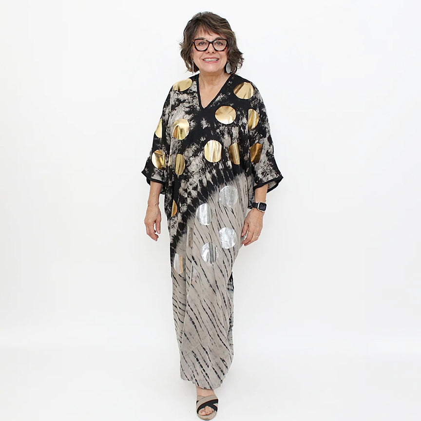 This mixed media mirage kaftan style dress is designed for those who appreciate a mix of fun and elegance in their wardrobe. The fabric of this dress is hand decorated one-at-a-time using itajimi, an ancient Japanese resist dyeing technique. Made of Rayon, the loose fit and flowy maxi is accented with gold and silver polka dots! Perfect for that holiday party. One size fits most; suggested fit to 3xl