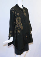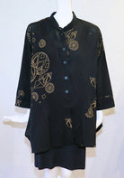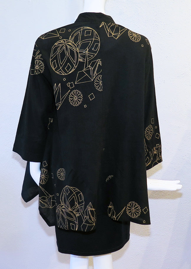 These Mao collar jackets from Yasuko's Japanese designers collection are 100% lightweight cotton with a subtle texture and stenciling to add interest. Button front, long sleeves, on-seam pockets, and asymmetrical flared hem. Our size recommendations are based on a loose fit. Size - S/M 42" bust; 26" length; M/L 44" bust; 26" - 32" flared hemline