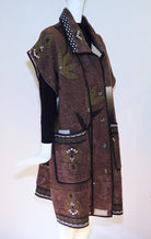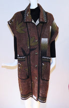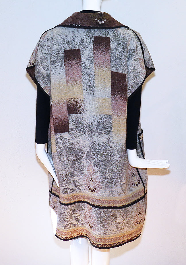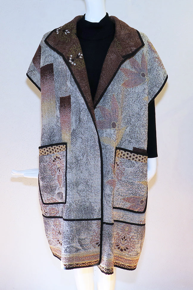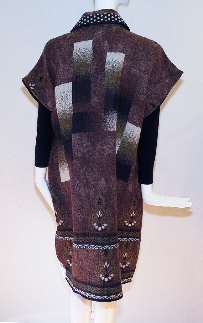 This long vest is a lightweight 100% merino wool. Super soft and fully reversible with pockets on both sides, button front on one side and open on the reverse. One size: 46" bust; 36" length. Hand wash and dry flat, or dry clean.