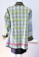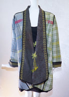 Make a statement with this shawl collar cotton kantha coat from Yaza.  This one-of-a-kind coat is made from vintage Kantha cotton fabrics with running handstitched details. It's fully reversible with pockets on both sides, making it great for travel! One size fits most: 44" bust; 30" overall length