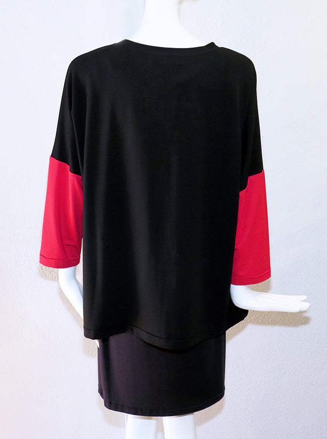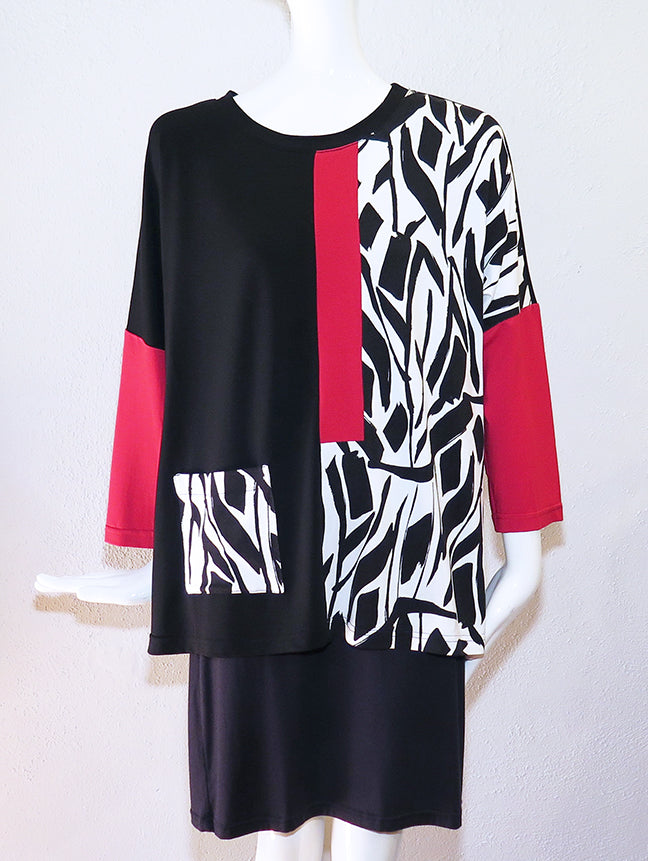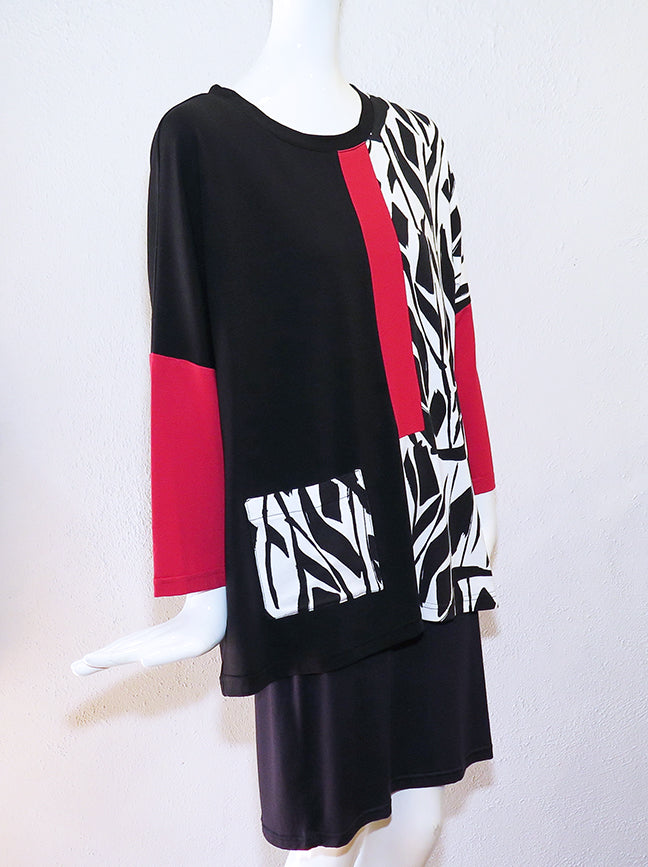 This cotton knit top has a bit of spandex for a super soft feel and easy drape. Red, white and black mixed fabric with bracelet length sleeves and contrast patch pocket. Machine wash/dry. 94% cotton/6% spandex. Made in the USA. XS - 44" bust; S - 46" bust; M - 48" bust; 26" length; size recommendations are for a relaxed fit