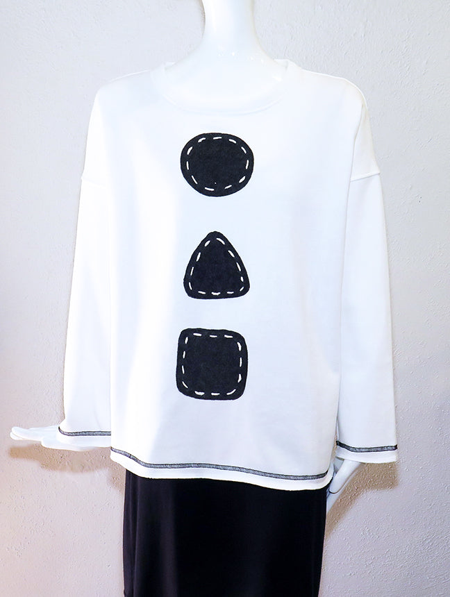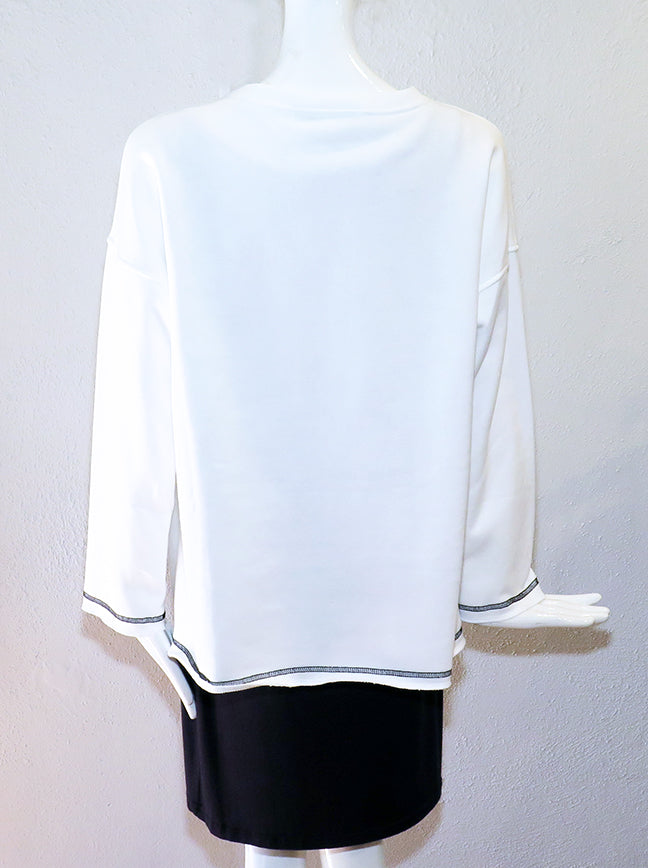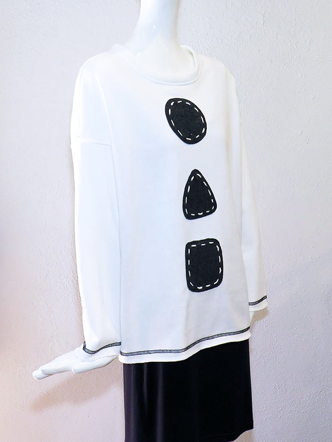 This cozy cotton top is a medium weight cotton sweatshirt fabric and features fun fabric embellishments with contrast stitching on the hem and sleeves. Off the shoulder relaxed style long sleeves. Machine wash/dry. 100% cotton. Made in the USA. XS - 42" bust; S - 44" bust; M - 46" bust; 24" length; size recommendations are for a relaxed fit