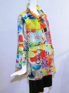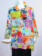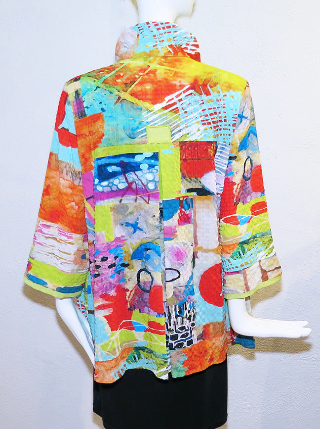 This Artsy jacket from Moonlight offers elegant style, taking you easily from day to evening. Adjustable collar, 3/4 sleeves with a notched cuff, fun rounded pocket with contrast piping, button front, and flattering A-line style. You can wear it as a blouse or jacket. Easy care poly; Machine wash, cold, gentle cycle; hang to dry. Made in the USA. S - 40" bust; M - 42" bust; L - 44" bust; 27" overall length; 48" hip width