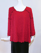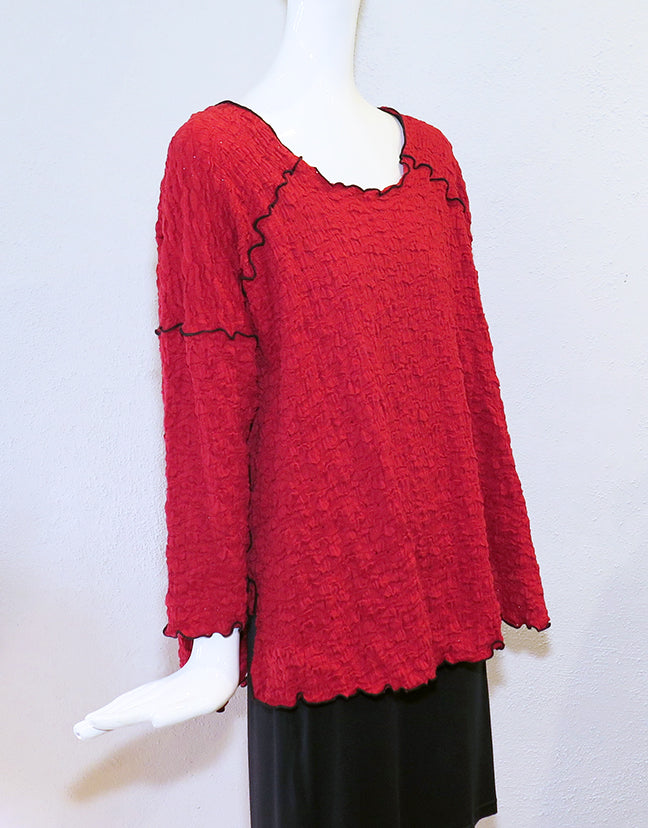 In richly textured, yet lightweight, pucker fabric, this poetic top has black contrast stitching and lettuce-edge hems. Relaxed, A-line silhouette, long sleeves and hip length. Size S - 50" bust, 25" length; M - 52" bust, 25" length. Available in red