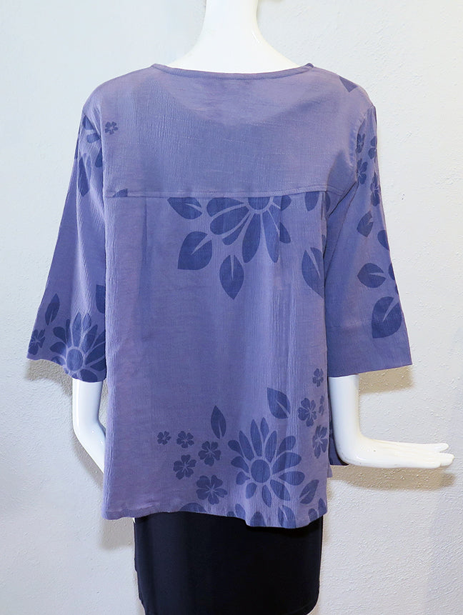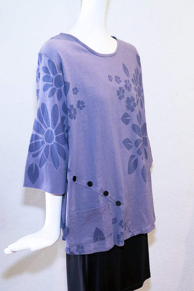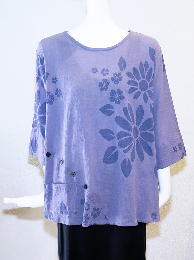 The Button blouse from Yasuko's Japanese designers collection are 100% cotton with a subtle texture and print to add interest. 3/4 sleeves, patch pocket and an A-line hem that is a little longer in the back for a fit that flatters. Our size recommendations are based on a comfortable fit. S/M - 40" bust; M/L 44" bust; 25"- 28" length