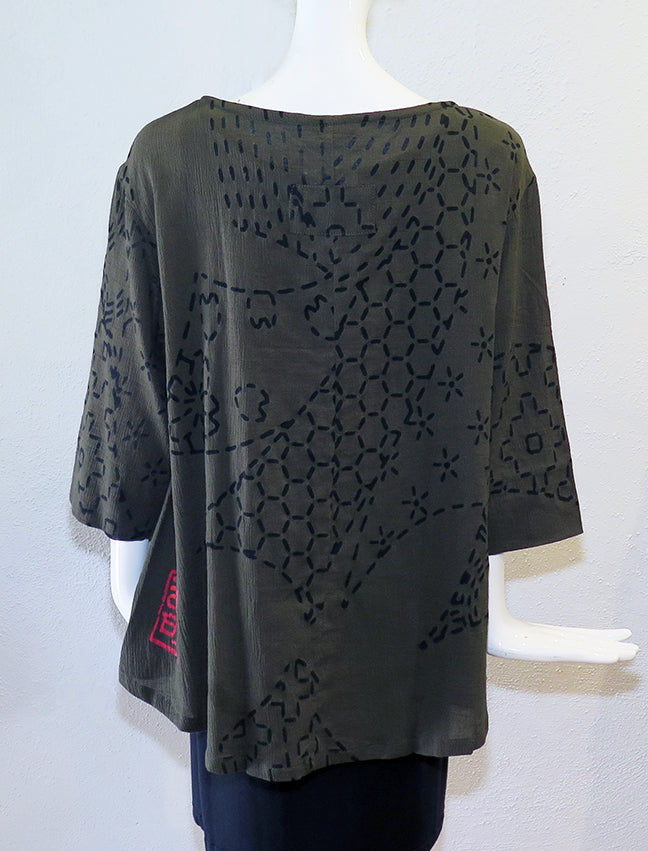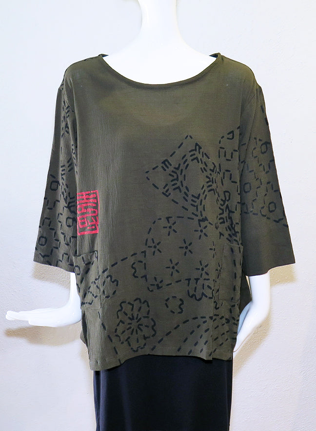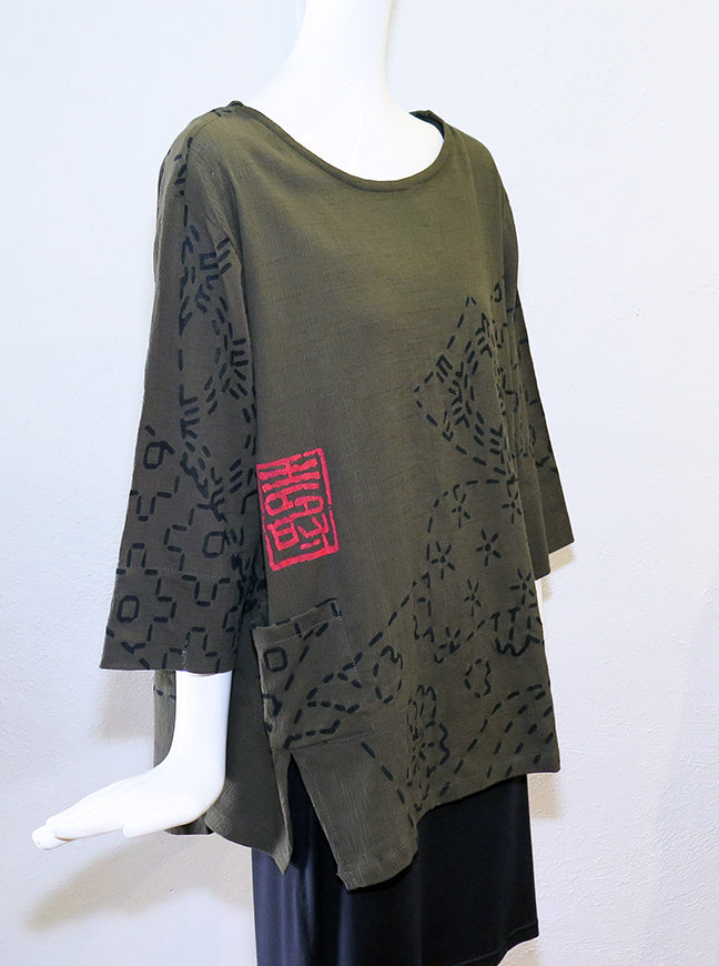 The El Blouse from Yasuko's Japanese designers collection are 100% cotton with a subtle texture and stenciling to add interest. 3/4 length sleeves, side slits, two patch pockets, and a slight A-line hem that's a little longer in the back. Our size recommendations are based on a loose fit • S/M 42" bust; 25" length; M/L 46" bust; 25" length.