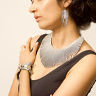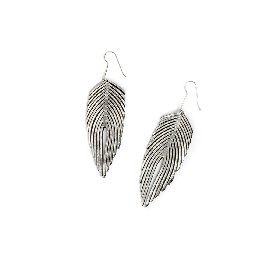 Lightweight earrings are crafted in metallic leather and laser cut to create ethereal feather-like plumes. Silver metallic with black niobium ear wires