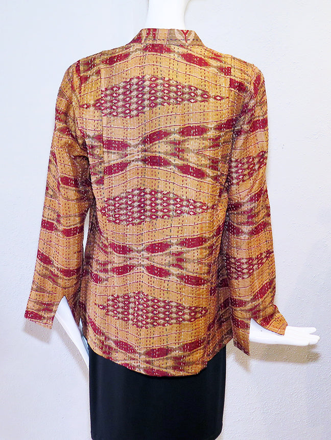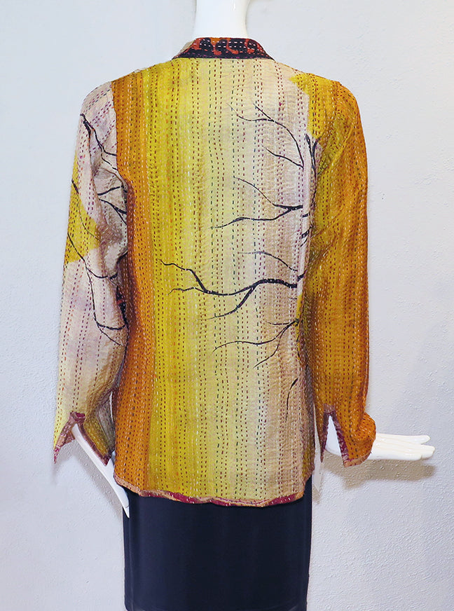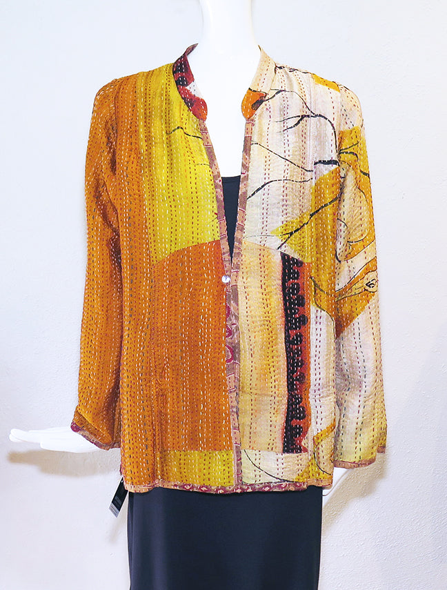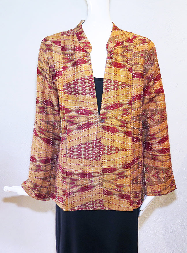 Saragossa is synonymous with unique and colorful. The fabric begins as recycled sarees from several Central Asian countries. The sarees are hand-stitched together to form kantha shawls. Then the shawls are used to create reversible jackets with an endless variety of unique print and color combinations.