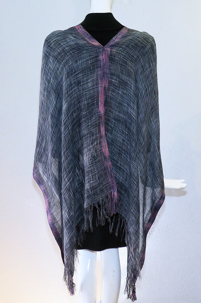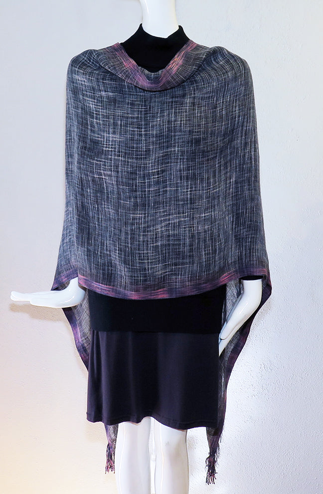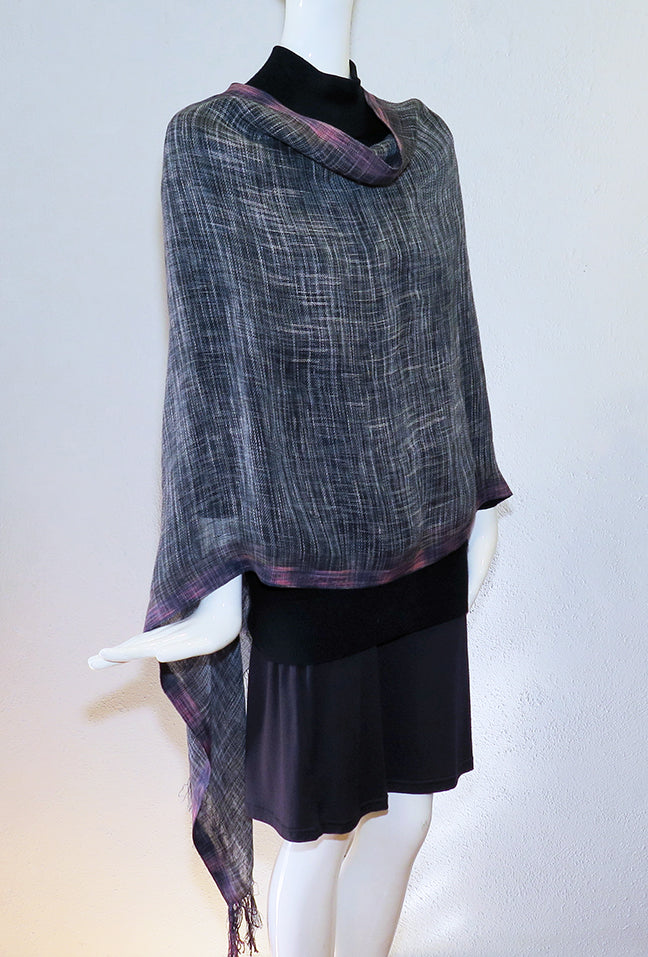 Karim's handwoven shrug is hand dyed IKAT linen in black and grey colorway with a contrasting silk selvedge and feathery light fringe. Slip it over your head and choose the look you want. One size fits most.
