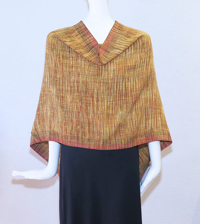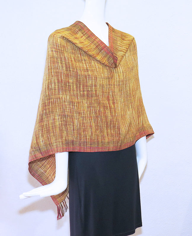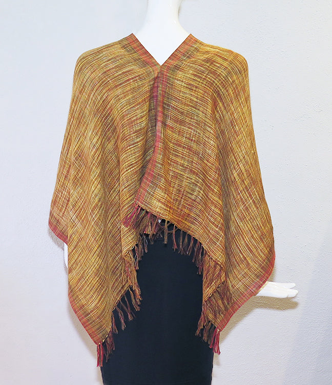 Karim's handwoven shrug is hand dyed IKAT silk and linen in a caramel colorway with a contrasting silk selvedge and feathery light fringe. Slip it over your head and choose the look you want. One size fits most.