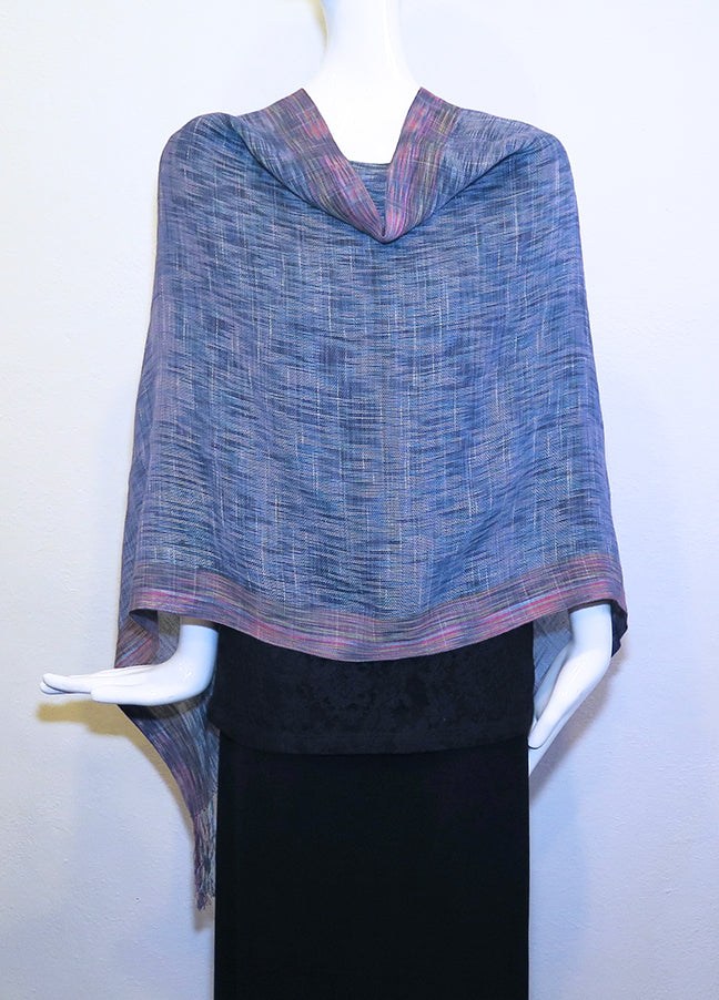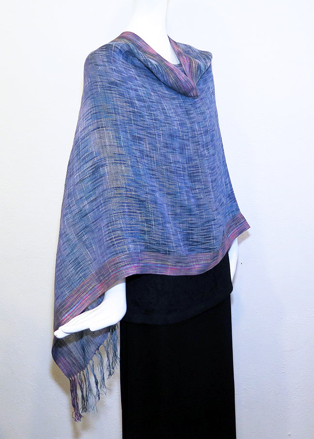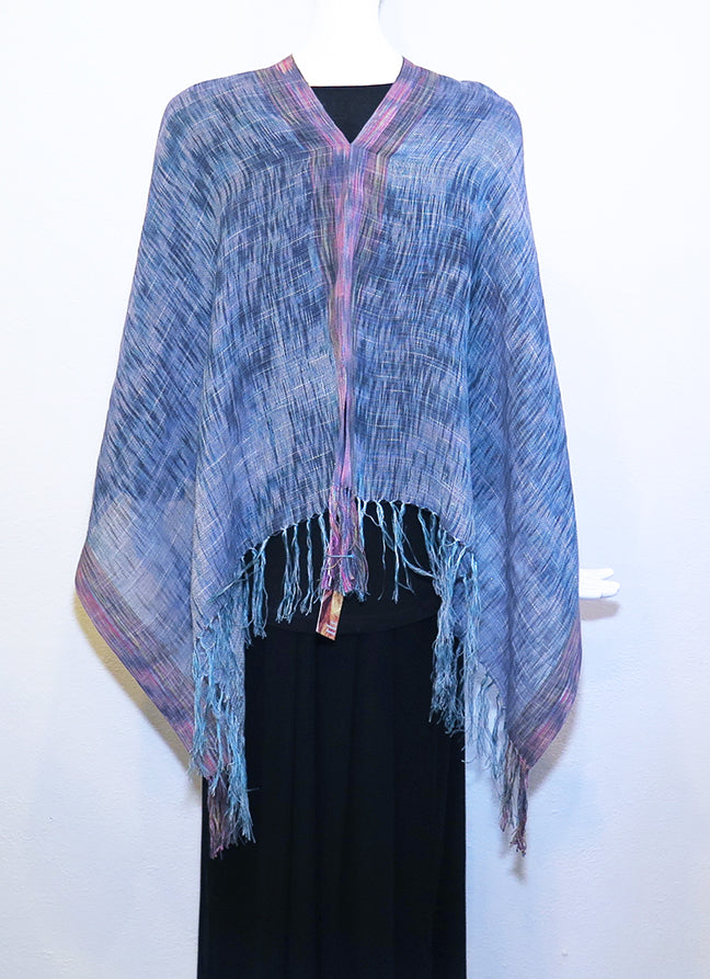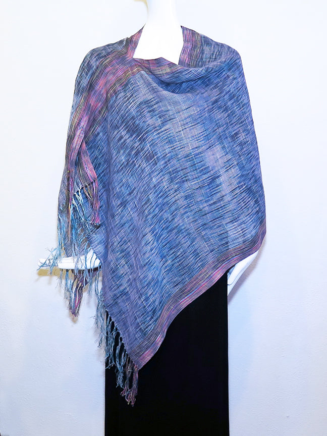 Karim's linen shrug is 100% hand dyed IKAT linen in a beautiful denim blue colorway with contrasting silk selvedge. Slip it over your head and choose the look you want. One size fits most.