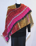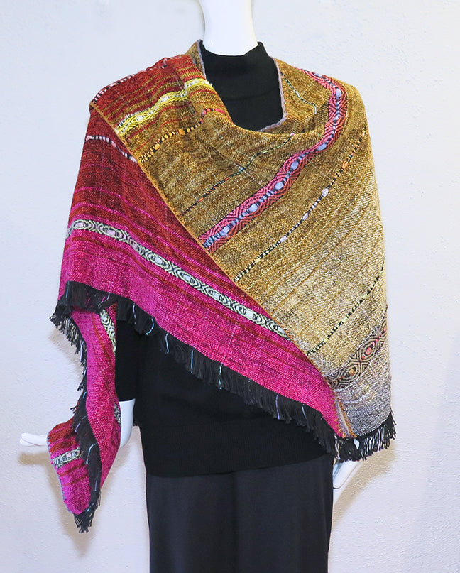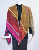 For the discerning collector, we have a few new beautiful, truly one of a kind, "ponchito shawls" by Nancy Paap. Enriched by fringes, ribbon work, and crochet edging, these shawls are very easy to wear. Especially good also for smaller ladies, as they are not overpowering in size, yet big enough to cover you and keep you warm. The rich colors and various laces and ribbons worked into the ponchito make any of her shawls look completely different, depending on which way you drape it around your shoulders.