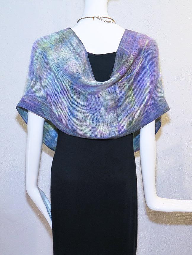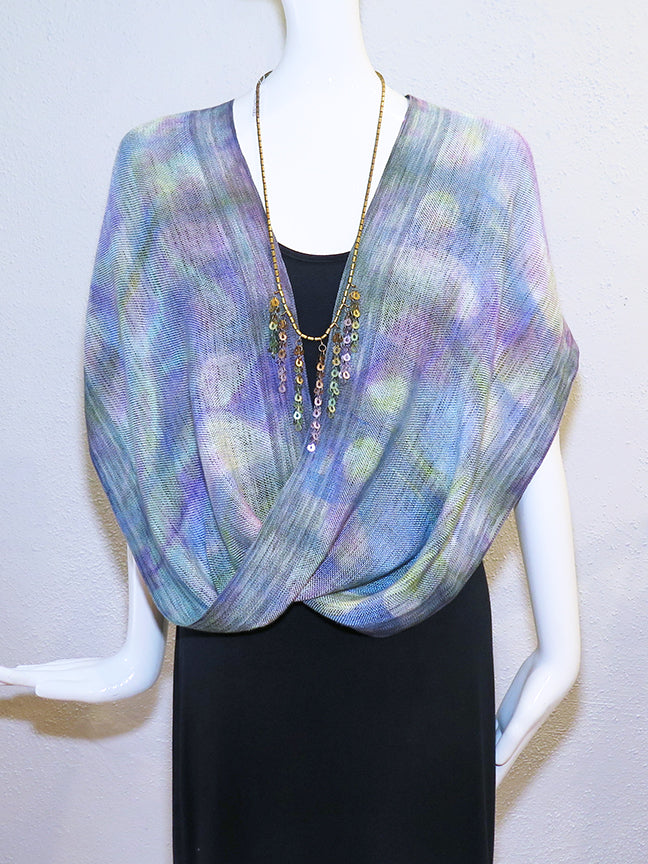 This lightweight mobius twist features Natasha's fabulous handwoven and hand-dyed shibori silk and linen fabric. Slip it over your head like a poncho and choose the look you want! One size fits most (13" overall warp width)