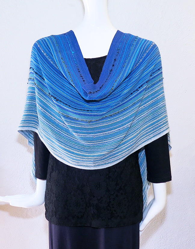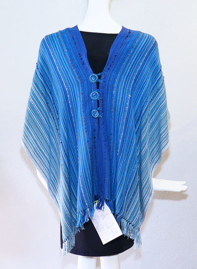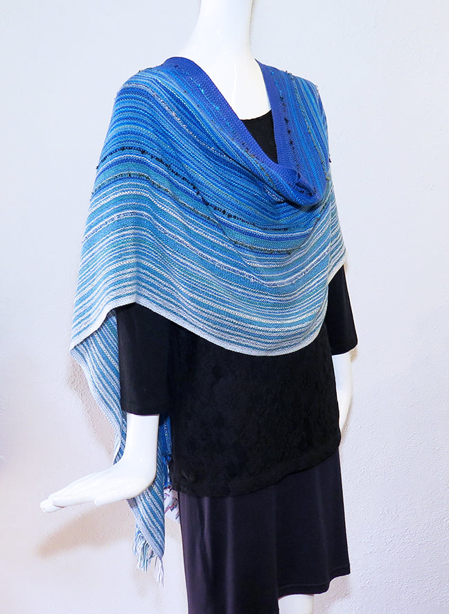 This handwoven original design was created by Randie Felts in Clarksville, Virginia. The "Oceans" Button Wrap is made from sustainable Tencel and cotton with hand painted rayon metallic and rayon loop for added sparkle and texture. The three handcrafted buttons and loops allow you to wear this piece multiple ways. Soft lightweight feel, elegant drape and easy care.  One size: 16” wide x 80” long with 2” untwisted fringe. Illustrations for ways to wear and care instructions included.