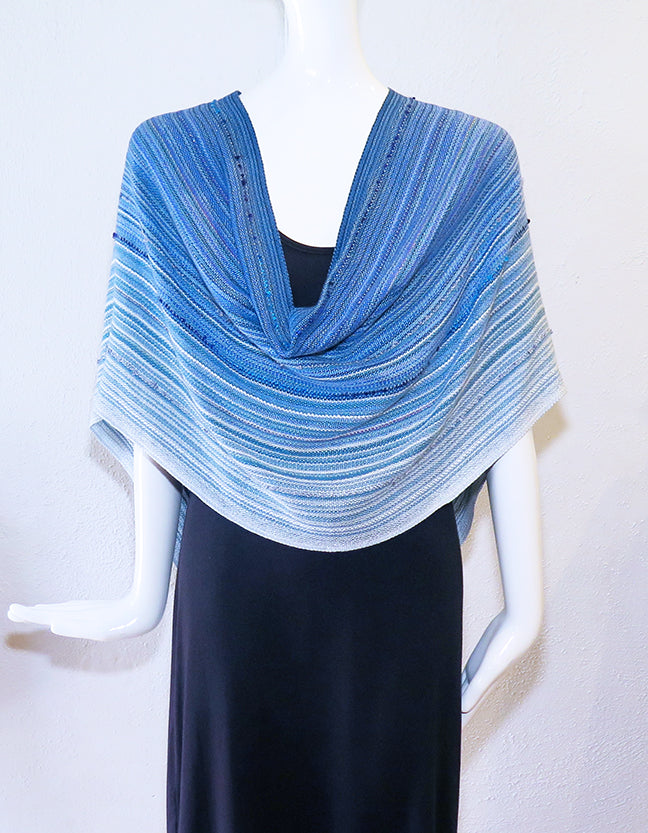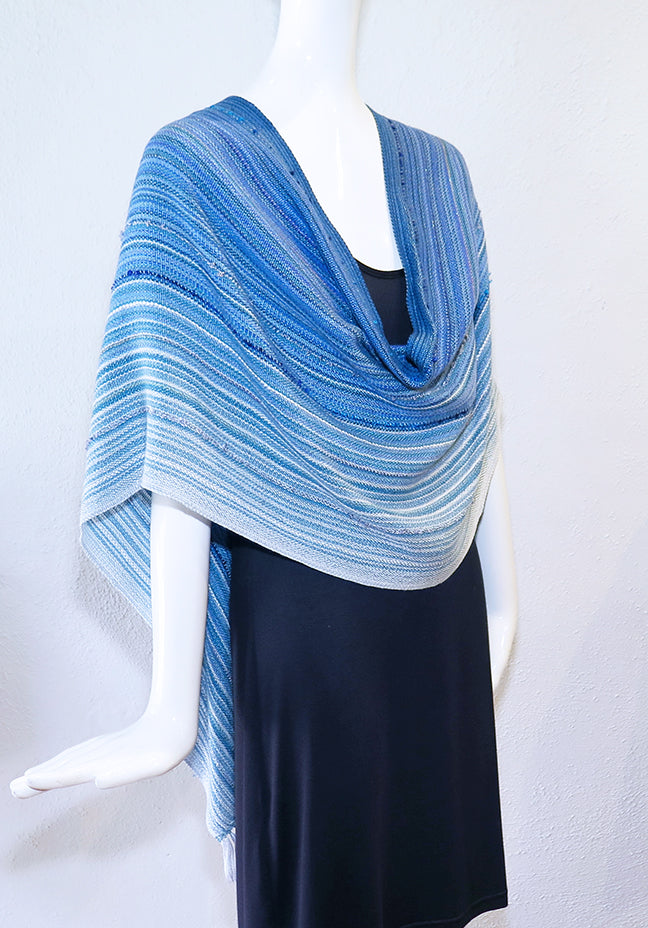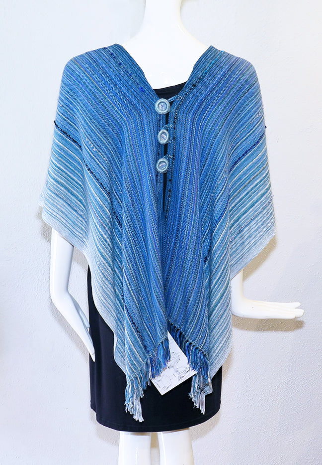This handwoven original design was created by Randie Felts in Clarksville, Virginia. The "Gulfstream" Button Wrap is made from sustainable Tencel and cotton with hand painted rayon metallic and rayon loop for added sparkle and texture. The three handcrafted buttons and loops allow you to wear this piece multiple ways. Soft lightweight feel, elegant drape and easy care. One size: 16” wide x 80” long with 2” untwisted fringe. Illustrations for ways to wear and care instructions included.