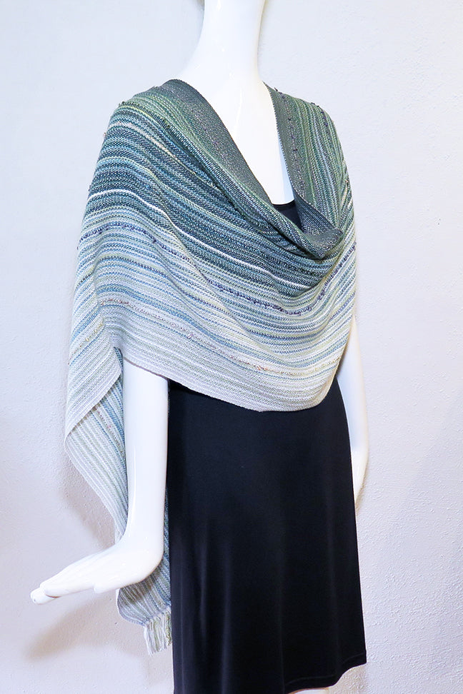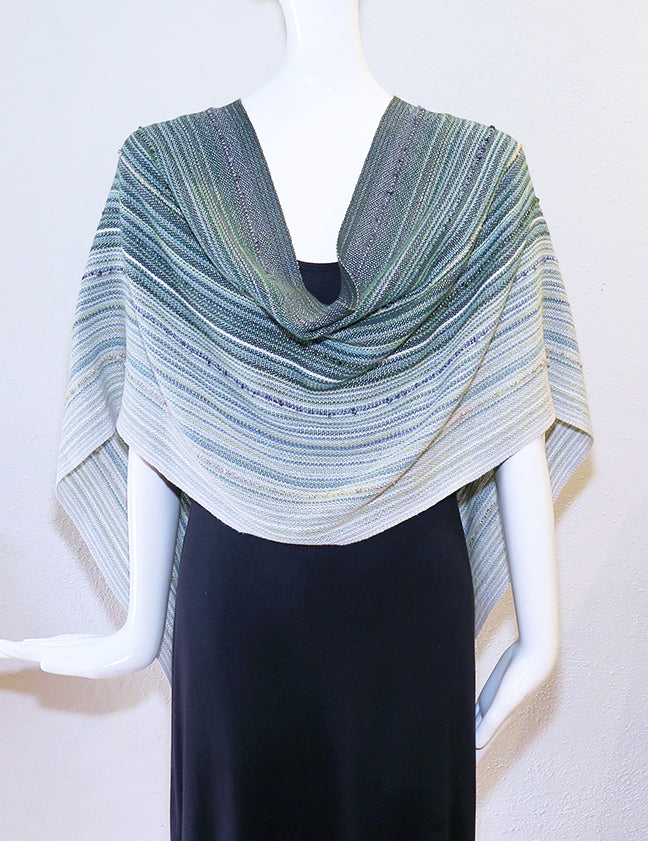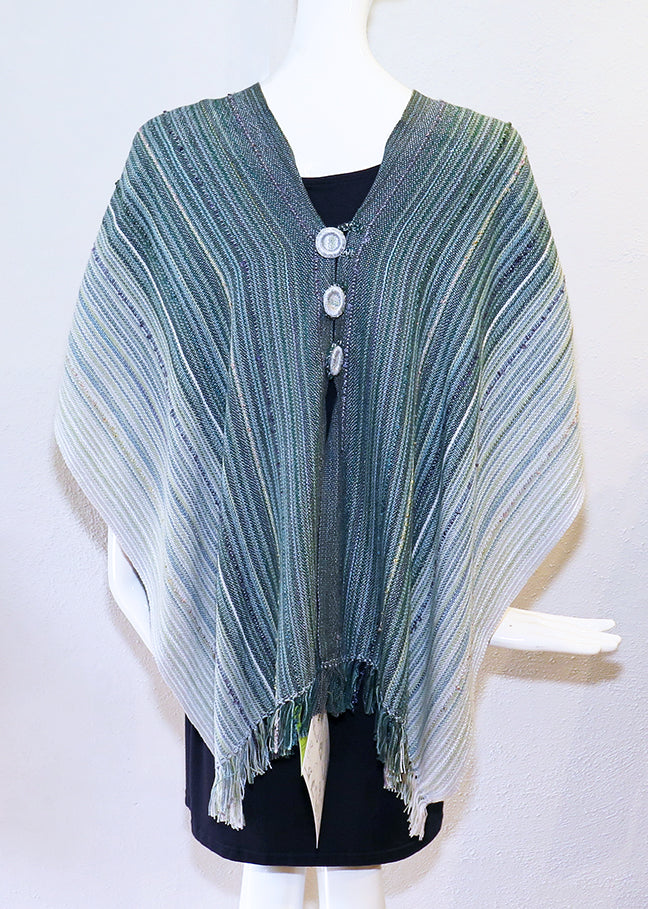This handwoven original design was created by Randie Felts in Clarksville, Virginia. The "Deep Forest" Button Wrap is made from sustainable Tencel and cotton with hand painted rayon metallic and rayon loop for added sparkle and texture. The three handcrafted buttons and loops allow you to wear this piece multiple ways. Soft lightweight feel, elegant drape and easy care.  One size: 16” wide x 80” long with 2” untwisted fringe. Illustrations for ways to wear and care instructions included.