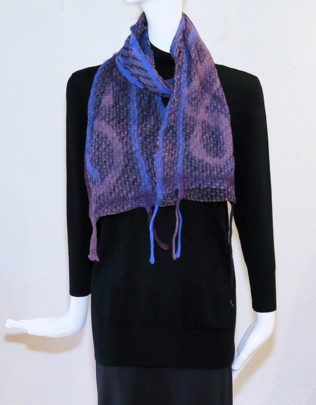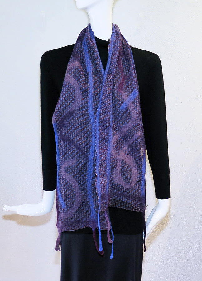 Cedide's Surprise Scarves are so much fun! Nuno felted silk and wool are combined for a beautiful one-of-a-kind wearable art scarf. Whisper light double layer silk and fine merino with mixed trims. Hand wash; line dry. 8" wide x 64" long, including felt fringe