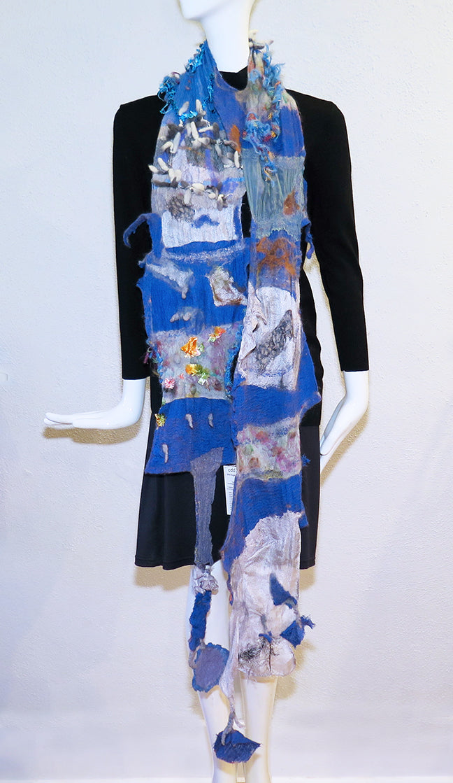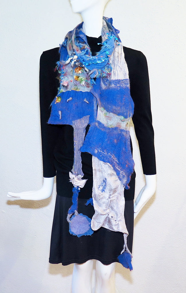 Cedide's Surprise Scarves are so much fun! Nuno felted silk and wool are combined for a beautiful one-of-a-kind wearable art scarf. Lightweight silk and fine merino with mixed trims. Hand wash; line dry. 8" - 10" wide x 96" long