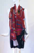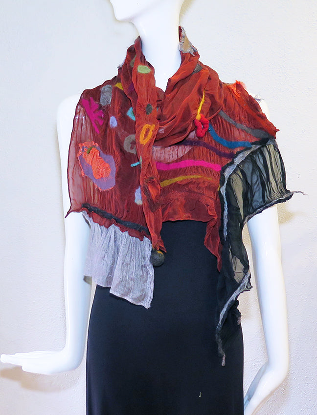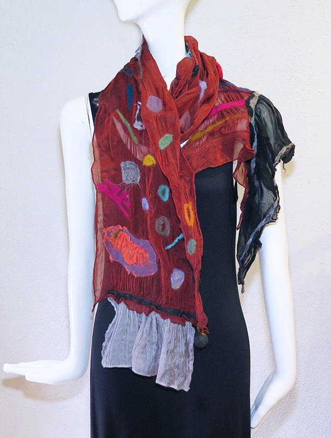 Cedide's Surprise Scarves are so much fun! Nuno felted silk and wool are combined for a beautiful one-of-a-kind wearable art scarf. Lightweight silk and fine merino with mixed trims. Hand wash; line dry. 10" wide x 72" long