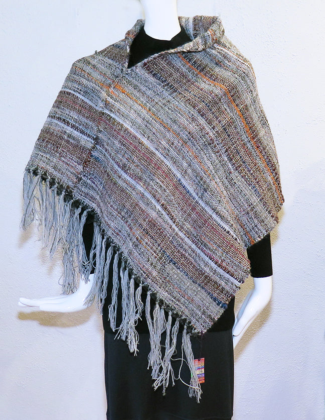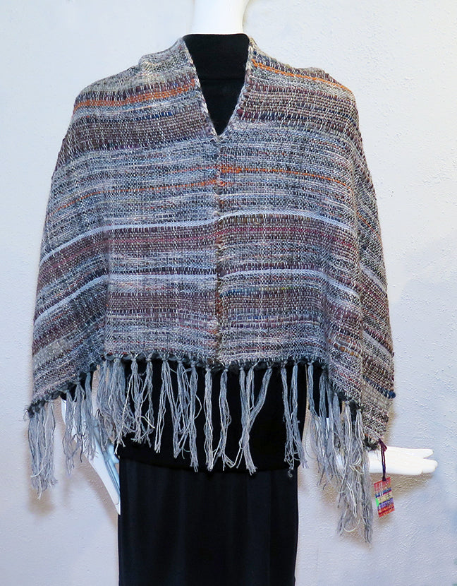 Sherry Gross at Loomstruck in Santa Fe uses natural fiber luxury yarns and chic embellishments in her handwoven, one-of-a-kind Saori weaving. This handwoven poncho style scarf is medium weight mix of wool, wolf hair and churro wool. The perfect topper for any outfit. Slip it over your head and find your favorite look. One size: 19" warp width; 30" side to side, including fringe. Hand wash cold, reshape and dry flat