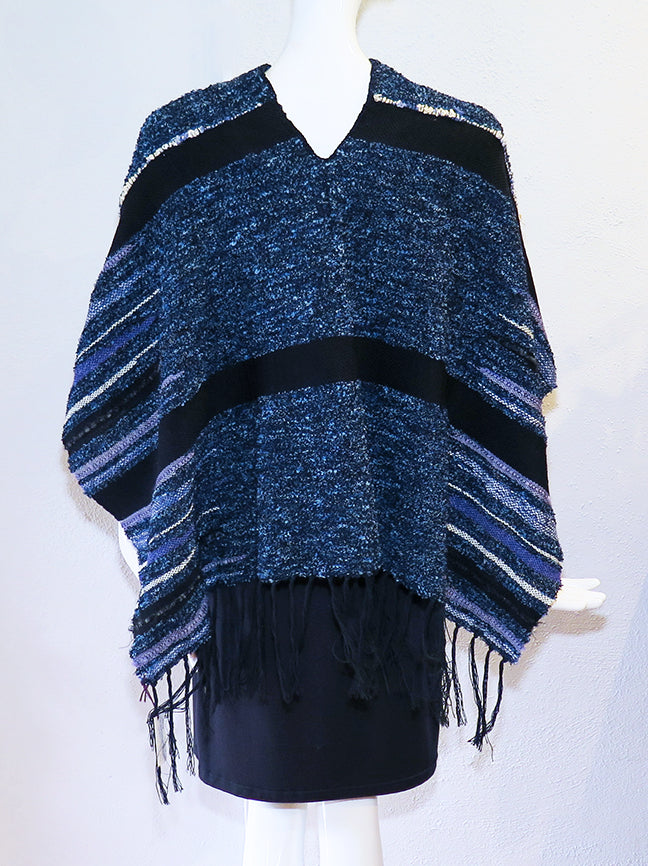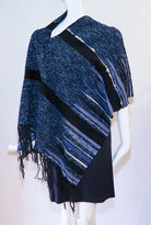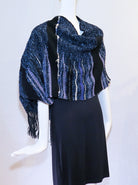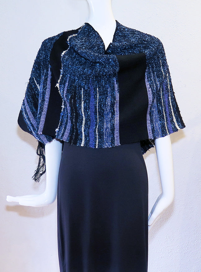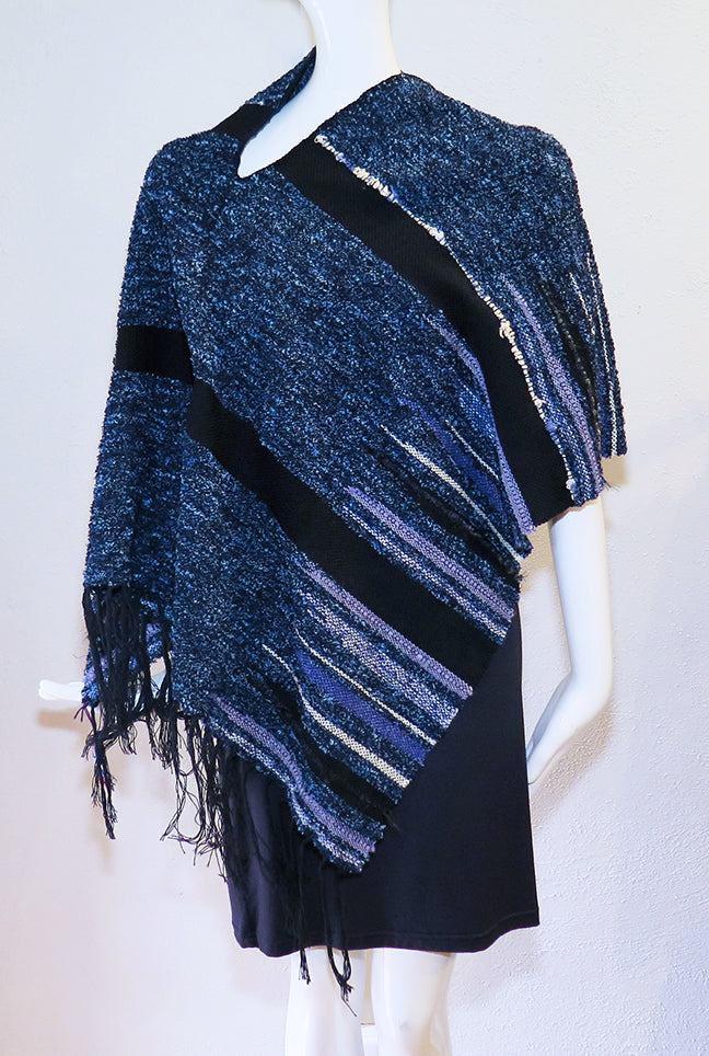 Sherry Gross at Loomstruck in Santa Fe has a love and fascination with color, texture, and novelty designs. She uses natural fiber luxury yarns and chic embellishments in her handwoven, one-of-a-kind art pieces. This handwoven shrug style poncho is textured mix of wool, cotton, mohair, nylon and silk. Slip it over your head and find your favorite way to wear it. One size: 16" warp width; 32" back length, including fringe; dry clean recommended
