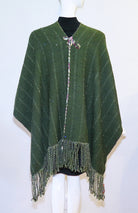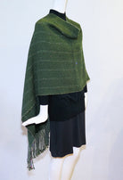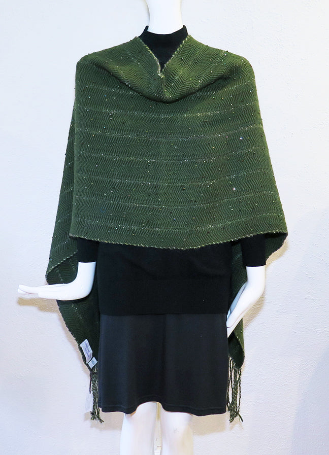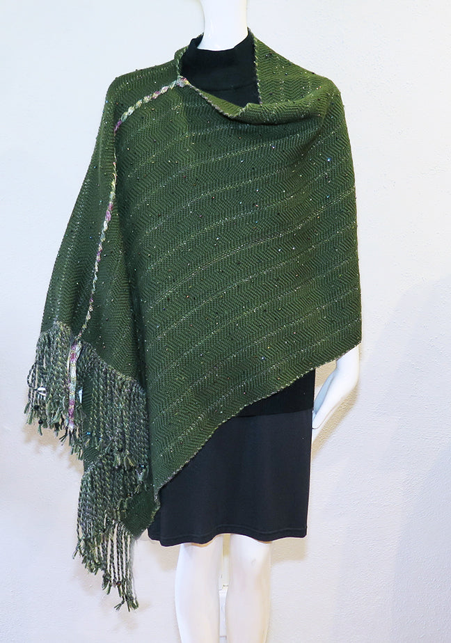 Sherry Gross at Loomstruck in Santa Fe uses natural fiber luxury yarns and chic embellishments in her handwoven, one-of-a-kind art pieces. This handwoven poncho is a heavier combination of wool and rayon ribbon; finished with Czech glass beads. Slip it over your head and find your favorite look. One size: 21" warp width; 40" length, including twisted fringe