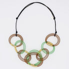 This handmade green and brown mesh necklace is made with mesh links, alternating in green and brown accented with gold bar beads all hung on an adjustable black wax cord.