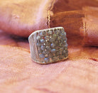 The faceted labradorite stones are beaded onto a single filament of precious metal wire for this wonderful rondel ring by Tana Acton • With rounded corners, and so easy to slide on and off any of your fingers because it is open and adjustable, this ring might just be your go to piece for whatever you wear • Strung on sterling silver, the height of the multi rows is 13/16", to create a stunning and eye catching impression. Adjustable size 6.5+