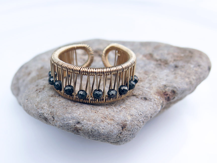 This plaited ring features 2mm faceted dark pyrite stones that move freely on the gold filled wire. With rounded corners, it's so easy to slide on and off any of your finger because it's open and adjustable • The height of the ring is 3/8"; adjustable size 6+