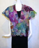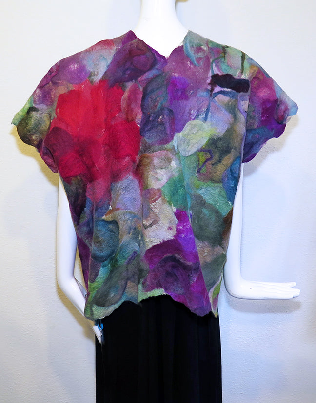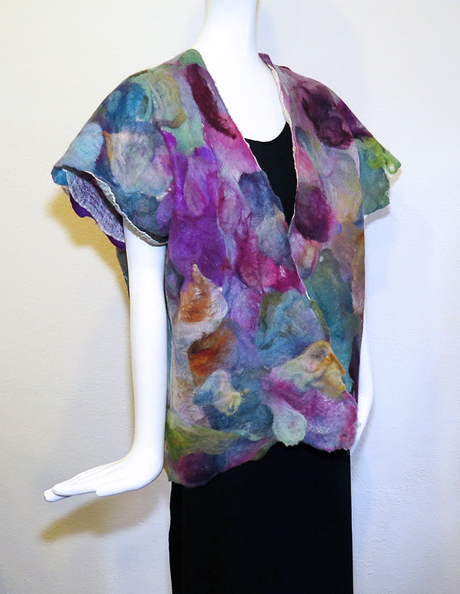Santa Fe fiber artist, Terri Wildermuth, loves bold statements and color! And so do we! This one-of-a-kind multi-textural kimono style jacket has a light-medium weight nuno felted merino wool exterior on a silk mesh lining with kimono style sleeves. Wear it open or add a closure that suits your style. One size: 48" bust, 24" overall length. Hand wash with mild soap, hang to dry