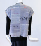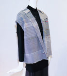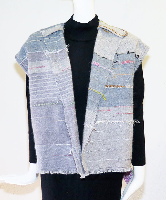 Darlene Wiedman is a Colorado weaver who embraces Saori Japanese weaving. Each of her pieces is one-of-a-kind and filled with organic styling this type of weaving is known for. This sweet little cropped vest is a lovely fine merino, cashmere and cotton, and is filled with interesting color and texture. One Size - 40" bust with relaxed closure; 17" long