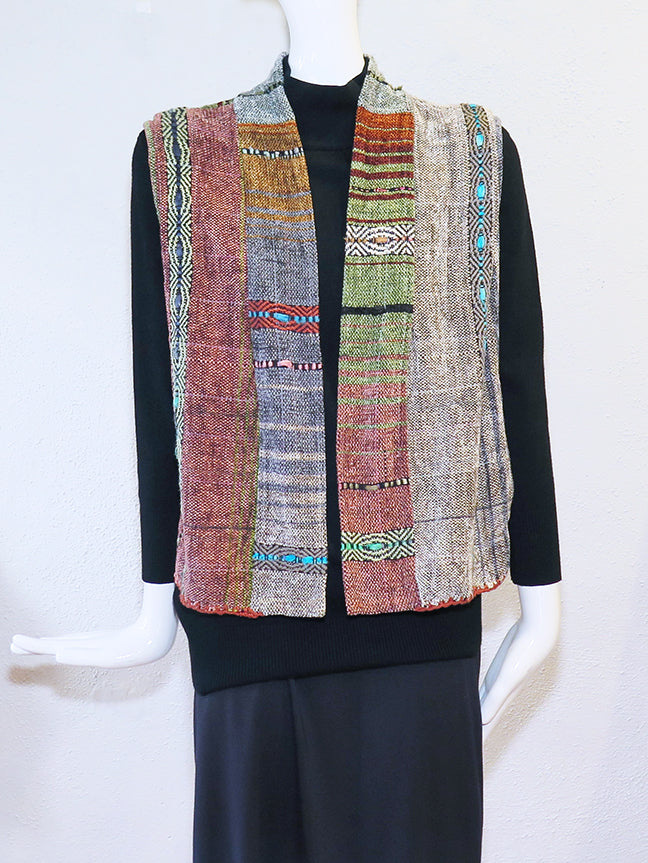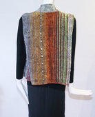 Nancy Paap creates all of her wovens in her studio in Tesuque, NM. Each of her pieces is a truly unique, one of a kind creation. Her "jewel vest" features pleats on the shoulders, angled side pockets, crochet edging at the bottom, and a shawl/collar along the front. While it looks stunning on a small lady, this vest can accommodate anybody up to size 12/14, because the pleats on the shoulder add width on the sides. Length is about 21". The unique pattern continues all across the back, with just the right amount of ribbons woven in to give it pizzazz.